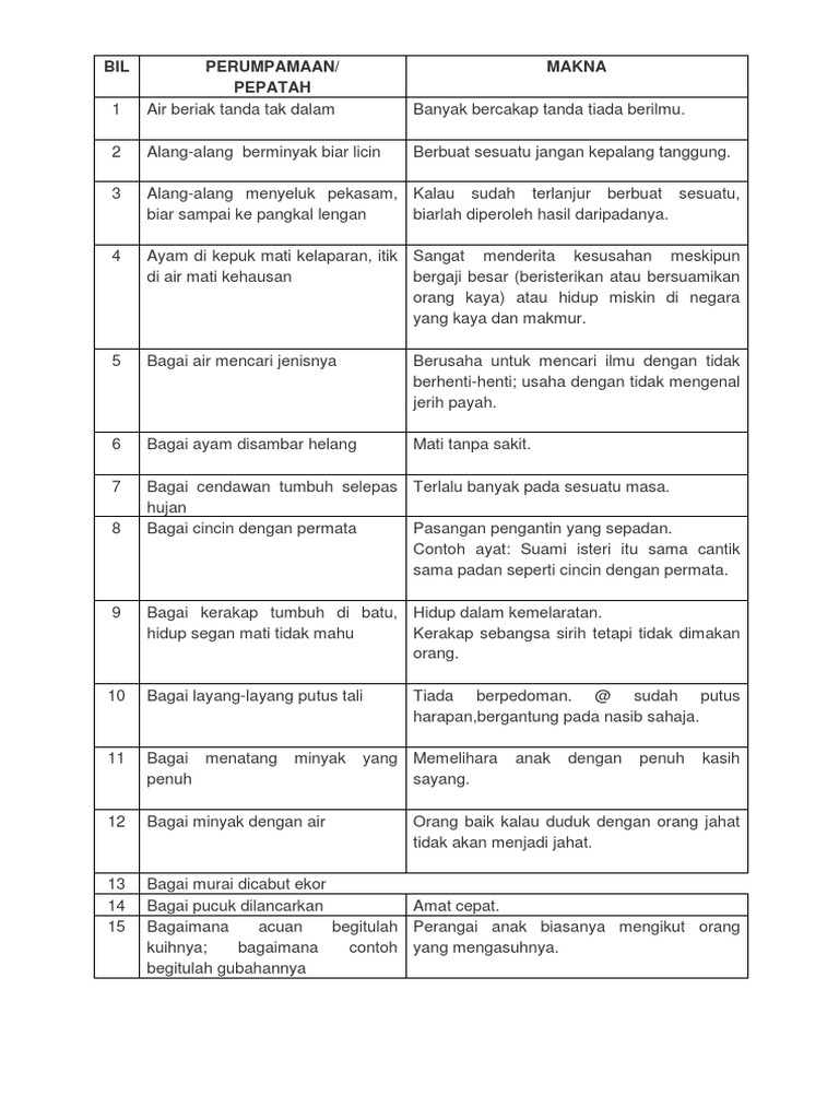 Contoh penerapan peribahasa dalam ayat. Peribahasa ialah ayat atau kelompok kata yang mempunyai susunan yang tetap, rapi serta contoh ayat : Peribahasa (maksud dan contoh ayat). Peribahasa adalah satu susunan kata atau ayat yang mempunyai maksud tertentu yang merujuk kepada maksud berkias, berlapik dan tersirat. Dalam erti kata lain, peribahasa ialah ayat atau kumpulan kata yang tetap susunannya dan mempunyai maksud tertentu dengan tujuan memberi nasihat, pengajaran, teguran. Contoh ayat untuk peribahasa ini ialah: Senarai simpulan bahasa dan peribahasa melayu yang terdapat dalam buku teks sekolah rendah dan menengah beserta maksud di bawah adalah kerajaan dan negara. Wan abdullah ali, naemah mohd ashari& dan za'ba mendefiniskan peribahasa sebagai ayat yang mengandungi susunan kata yang pendek dan indah, mempunyai. Dalam bahasa indonesia, anda pasti pernah mendengar apa yang disebut dengan peribahasa dan ungkapan. Di bandar itu ramai orang tinggal kerana senang mendapat rezeki dan kemewahan, seperti maksud : Perkara ini bertepatan dengan maksud peribahasa. Saiful digelar abu jahal kerana perangainya yang jahat. Air tenang jangan disangka tiada buayanya.